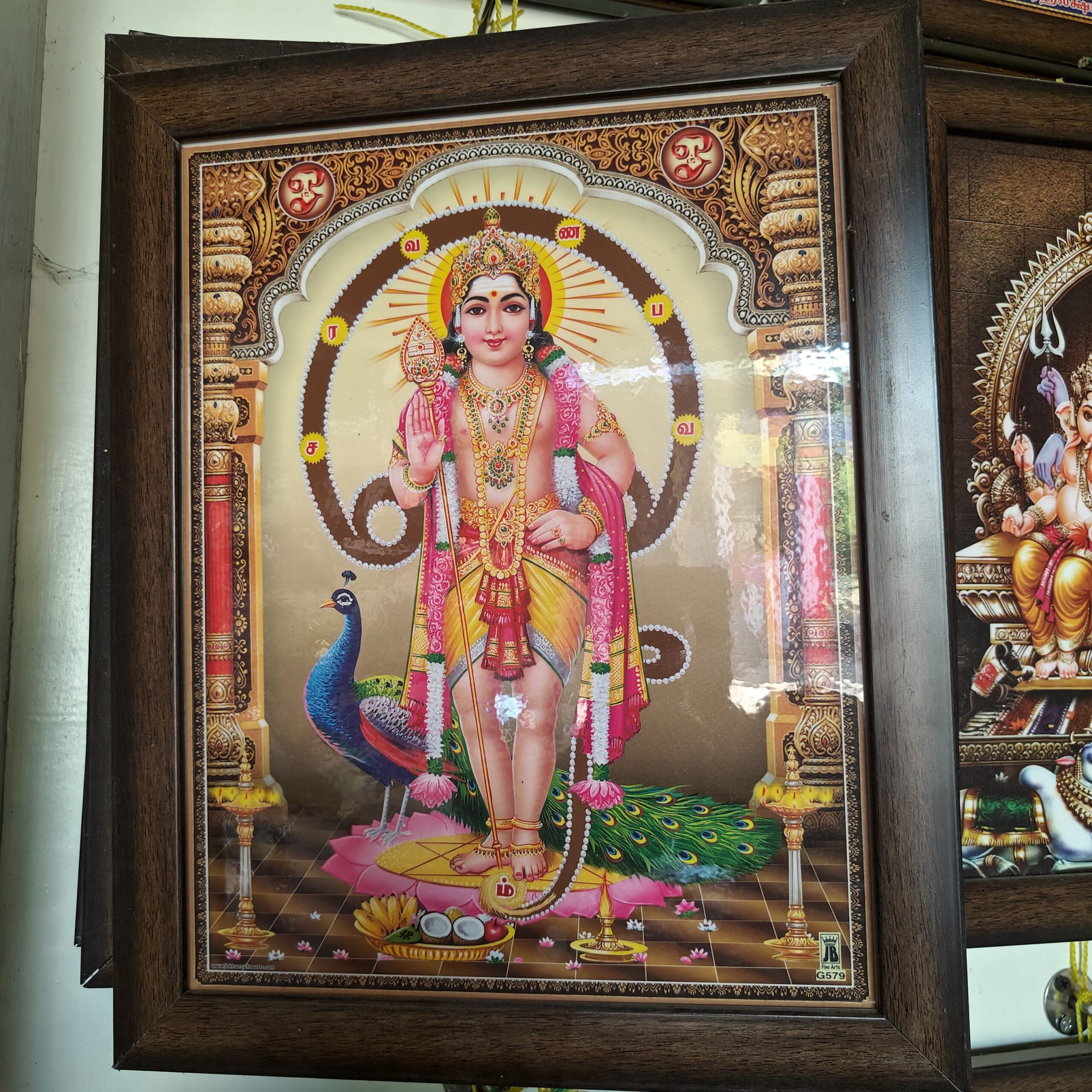 A Lord Murugan photo frame is a decorative and devotional item that features the image of Lord Murugan (Kartikeya), the Hindu god of war and victory, revered as the son of Lord Shiva and Goddess Parvati. These photo frames are often placed in homes, temples, and offices to bring spiritual energy, courage, and prosperity.